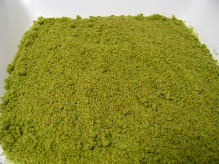 Comece por triturar as tostas junto com as ervas. Vai obter um pão ralado esverdeado como este: